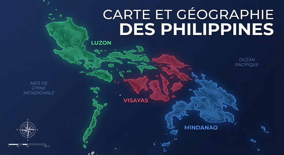 La carte des Philippines se divise géographiquement en trois grands groupes d'îles : Luzon au nord (abritant la capitale Manille), les Visayas au centre (cœur touristique et balnéaire) et Mindanao au sud. Cet archipel d'Asie du Sud-Est compte plus de 7 600 îles s'étendant sur 1 850 km, bordées par la mer de Chine méridionale et l'océan Pacifique.